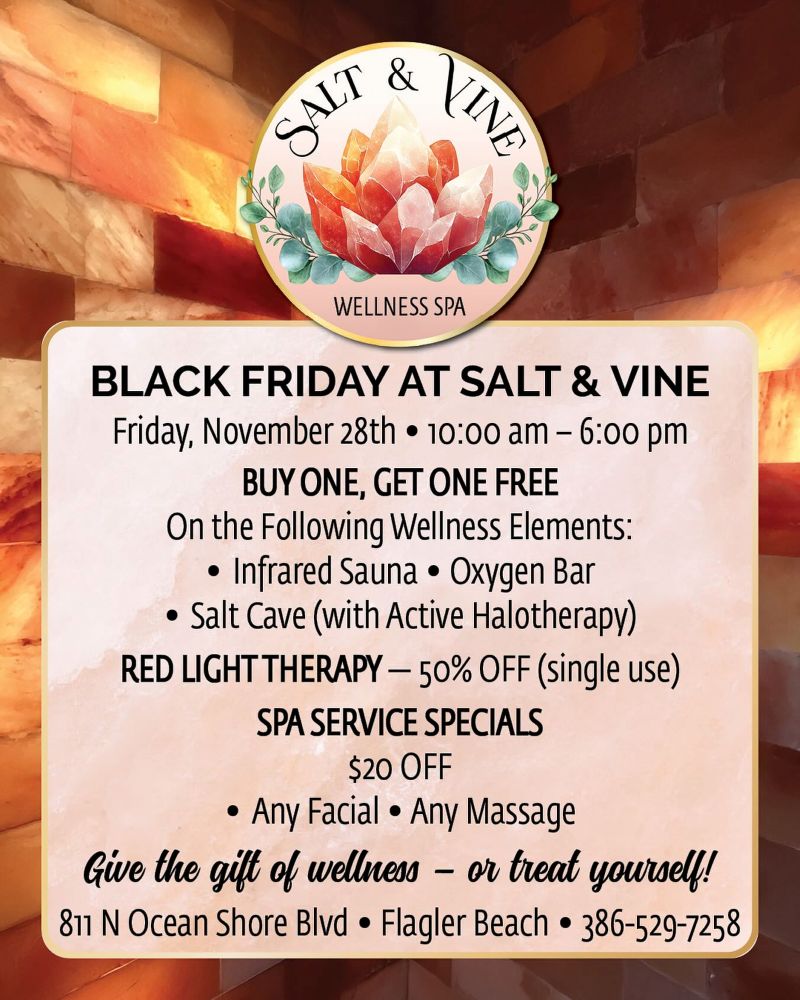 Celebrate Black Friday with exclusive wellness savings at Salt & Vine Wellness Spa! Enjoy our biggest deals of the year — including Buy One, Get One Free on select wellness elements, 50% off Red Light Therapy, and $20 off any facial or massage.