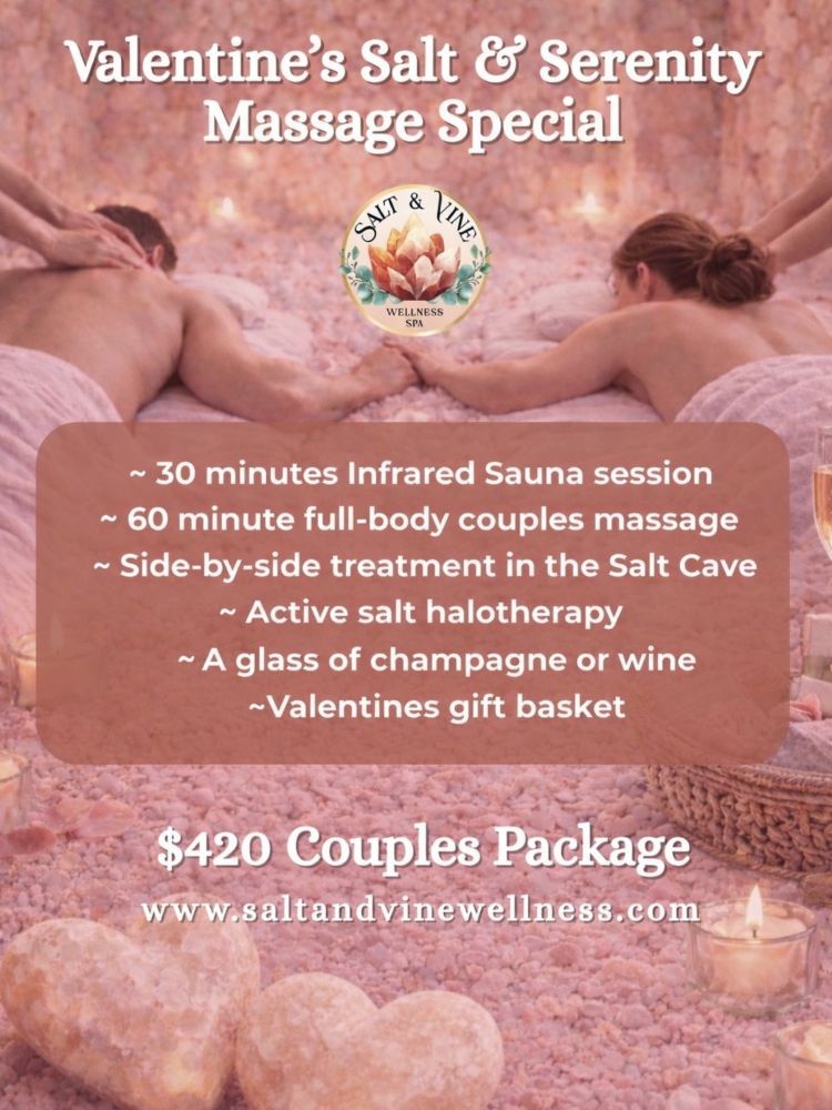 Reconnect and unwind with this thoughtfully curated Valentine’s experience, designed to melt stress away and create meaningful moments together. Begin with a 30-minute infrared sauna session enhanced with chromotherapy to gently warm the body, ease tired muscles, and support detoxification. You’ll then transition into a 60-minute full-body couples massage, performed side-by-side in the tranquil Salt Cave with active halotherapy, which includes the following: