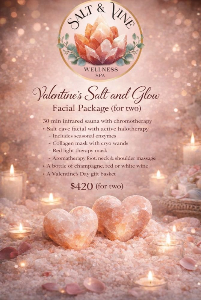 Celebrate connection and relaxation with this thoughtfully curated Valentine’s experience, perfect for couples or friends to enjoy together. Begin with a 30-minute infrared sauna session enhanced with chromotherapy to gently warm the body, release tension, and support detoxification. You’ll then transition into our Signature Salt Cave Facial, which includes the following featured treatments: